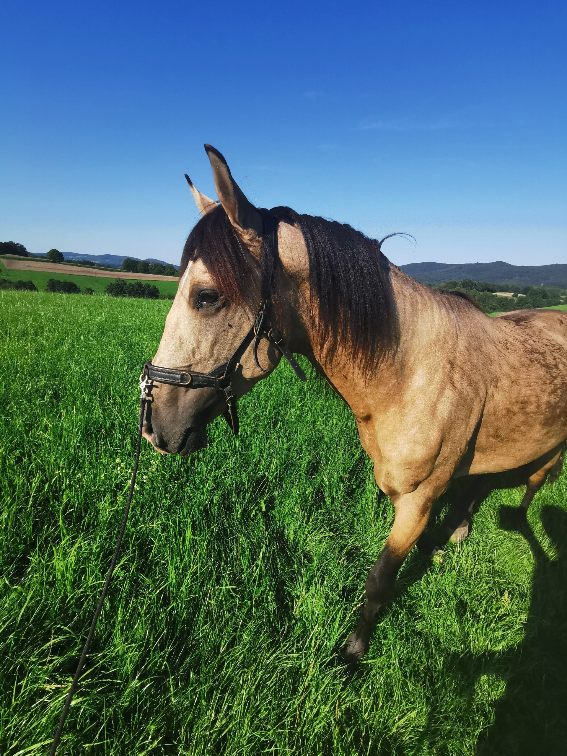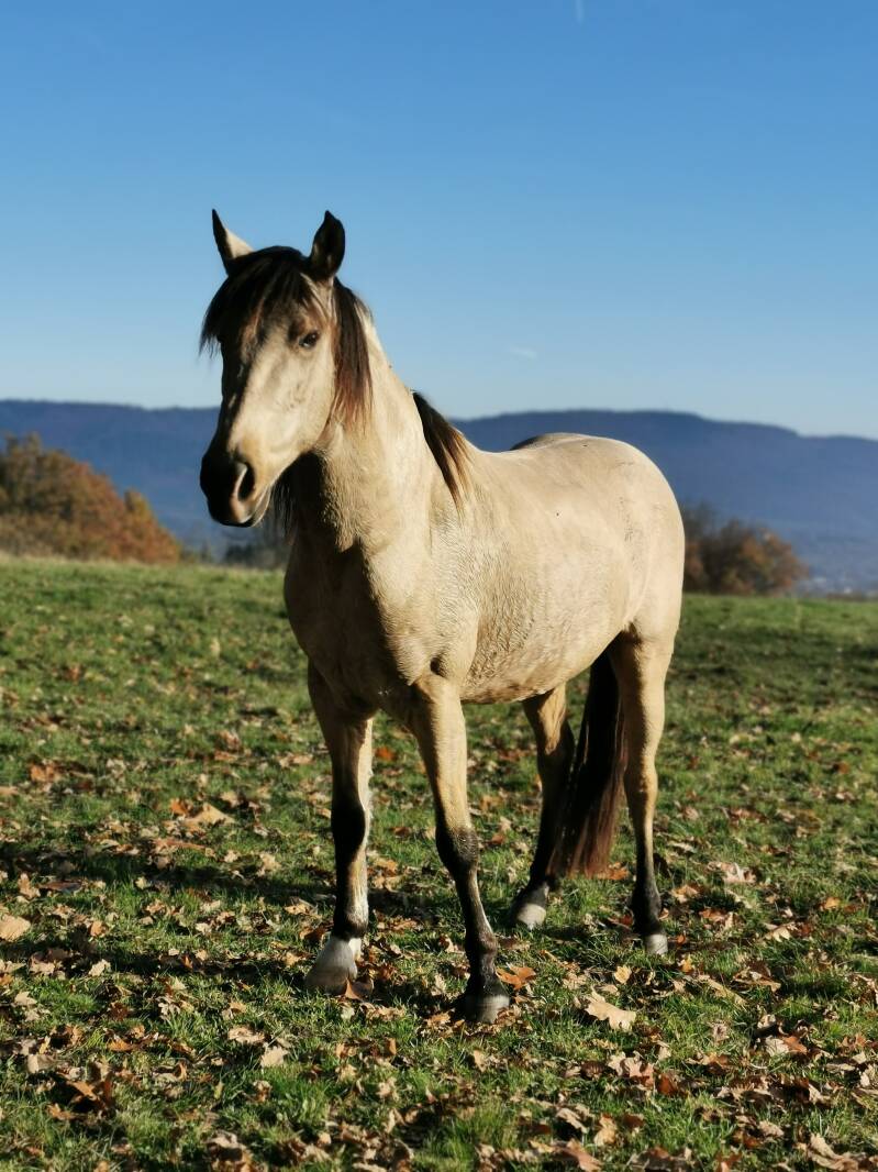 Ramiro ist ein mittlerweile 7-jähriger Lusitano und seine Geschichte ist sehr besonders. Was ich über seine Herkunft weiß, ist, dass er in Portugal wild aufgewachsen ist, dann innerhalb von Portugal und Spanien 3x verkauft wurde, bis er mit 2 Jahren nach Deutschland kam. Was ihm in dieser Zeit passiert ist, kann ich nur erahnen, jedenfalls nichts gutes, aber mehr dazu im späteren Verlauf. Ich erhielt einen Anruf einer Freundin, dass ich doch mal erzählt hätte, ich würde von einem Spanier träumen....Ganz in der Nähe würde ein Lusitano-Falbe abgegeben werden. Ich kannte die Besitzerin und meldete mich. Sie erzählte mir, dass sie mit ihrem jungen Portugiesen nicht wirklich klar käme und sie ihn abgeben möchte und würde sich sehr freuen, wenn er in meine Hände käme. Also fuhr ich hin. Ramiro stand wirklich nicht gut da, er war zu dünn, hatte eine katastrophale Haltung, zeigte mehrere Muskelabrisse, war durchtrittig und auch in der Wirbelsäule war eine kleine Krümmung zu sehen. Nie zuvor hatte ich ein Pferd mit so viel Unsicherheit und Angst gesehen im ganzen Körper. Er war ein kleines Häufchen Elend. Eine AKU machte keinen Sinn, die hätte er eh nicht bestanden, also nahm ich ihn zu mir. Ramiro hatte zum Zeitpunkt als ich ihn anschaute große Angst vorm Halftern, deshalb trug er das Halfter laut Besitzern rund um die Uhr . Am Tag als ich ihn holte, stand er auf der Weide und als wir auf die Weide liefen, sagte die Besitzerin noch zu mir "Ich bin gespannt wie lange wir zum einfangen brauchen". Ich wollte mit ihm nach Hause laufen, da das nur 5km von mir zuhause entfernd war. Ich wollte ihm keine Hängerfahrt zumuten. Also stiefelte ich mit meinem Kappzaum an die Koppel. Lief einige Schritte auf ihn zu und streckte meine Hand aus und wartete. Ramiro kam, ließ sich ohne Zucken den Kappzaum aufziehen und wir liefen davon , als wäre es das normalste der Welt. Er drehte sich nicht um, er wieherte seinen Freunden nicht nach, voller Freude schaute er nach Vorne...er spürte wohl, dass nun ein Neuanfang anstehen würde- Bei den Erinnerungen bekomme ich immernoch Gänsehaut!Schnell zeigte sich zuhause, welch ein heftiges Trauma er in sich trug. Er zeigte ein Angstkrampfen, sobald er eingesperrt war. Männer waren ganz schlimm. Sobald mein Papa, mein Bruder oder mein Mann in der Nähe waren, ging er zusammen wie ein Hund , der den Schwanz einzieht. Der Körper zitterte und man dachte, er atmet nicht mehr. Dieses Verhalten ist mittlerweile weg. Aber es war ein langer Weg! In meinen Videos seht ihr das erste Ausbildungs-Jahr gefilmt als Zusammenschnitt. Ramiro besteht mittlerweile aus purer Lebensfreude und ist ein riesen Goldschatz. Er möchte alles richtig machen und ist hochmotiviert. Freiheitsdressur, Zirkuslektionen, Handarbeit, egal was ich abfrage, er ist voll dabei und gibt immer sein Bestes. Allerdings gibt es auch eine Schattenseite - denn außer mir traut Ramiro eigentlich niemandem wirklich über den Weg. Er ist eine absolute One-Man-Show und braucht SEINEN Menschen, der ihm Sicherheit gibt. Ramiro hat mein gesamtes Know-How gefordert und ist der beste Lehrmeister. Er hat nach wie vor körperliche Defizite und ich bin mir auch nicht sicher, ob diese jemals ganz zu beheben sind. Vermutlich hatte er eine Gewalteinwirkung auf den Rücken. Dadurch ergaben sich Schmerzen und eine daraus resultierende Schonhaltung, die er bis heute nicht abgelegt hat. Er kann nicht dösen und steht entweder fest auf allen Beinen oder liegt. Unzählige Behandlungen sind bereits erfolgt. Aber ich gebe niemals auf. Ramiro hat den Vorteil, dass er noch sehr jung ist und sich hier im Körper noch viel verändern kann. Für mich ist er etwas ganz besonderes und ich bin wirklich sehr dankbar, dass er meinen Weg gekreuzt hat. (Das erste Bild zeigt unseren Heimweg, als ich ihn mit nach Hause genommen habe.)