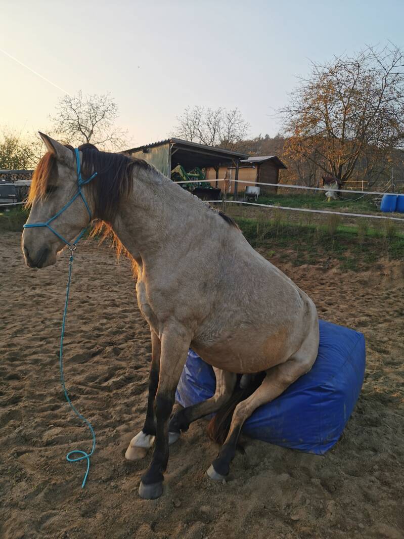 So besuchte ich ab dem Zeitpunkt seines Einzugs unzählige Kurse bei diversen namenhaften Trainern und bildete mich fort. Akito ist immernoch ein echtes Schlitzohr und verlangt volle Konzentration wenn man mit ihm arbeitet. Jede Ablenkung meinerseits bleibt niemals unbemerkt. Wenn man aber bei der Sache ist,. ist Akito hoch motiviert dabei und liebt im Gegensatz zu Dancer Zirzensik. Die Freirbeit macht er auch anständig, allerdings brennt sein Herz eher in der klassischen Handarbeit und in der Zirzensik. Auf dem Sitzsack zu sitzen ist dabei seine absolute Lieblingsübung!